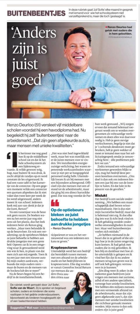 „Ik ben blij en dankbaar met hoe alles uiteindelijk is gelopen en ik vind het fijn dat ik nu andere mensen terug kan geven wat ik zelf ook heb gekregen: vertrouwen in je kunnen. GreenFox draait nu goed en ik kom in de fase van besturen in plaats van zelf aan het roer te zitten. Eén ding weet ik zeker: in de toekomst gaan bedrijven juist vrágen om mensen met autisme, adhd of een andere specialiteit, vanwege hun unieke kwaliteiten. We hebben één miljoen mensen met een vermeende afstand tot de arbeidsmarkt, maar dat zijn geen afgekeurde auto’s, dat zijn mensen met unieke kwaliteiten die zichtbaar gemaakt moeten worden. Mijn motto is dan ook: anders zijn is juist goed.”